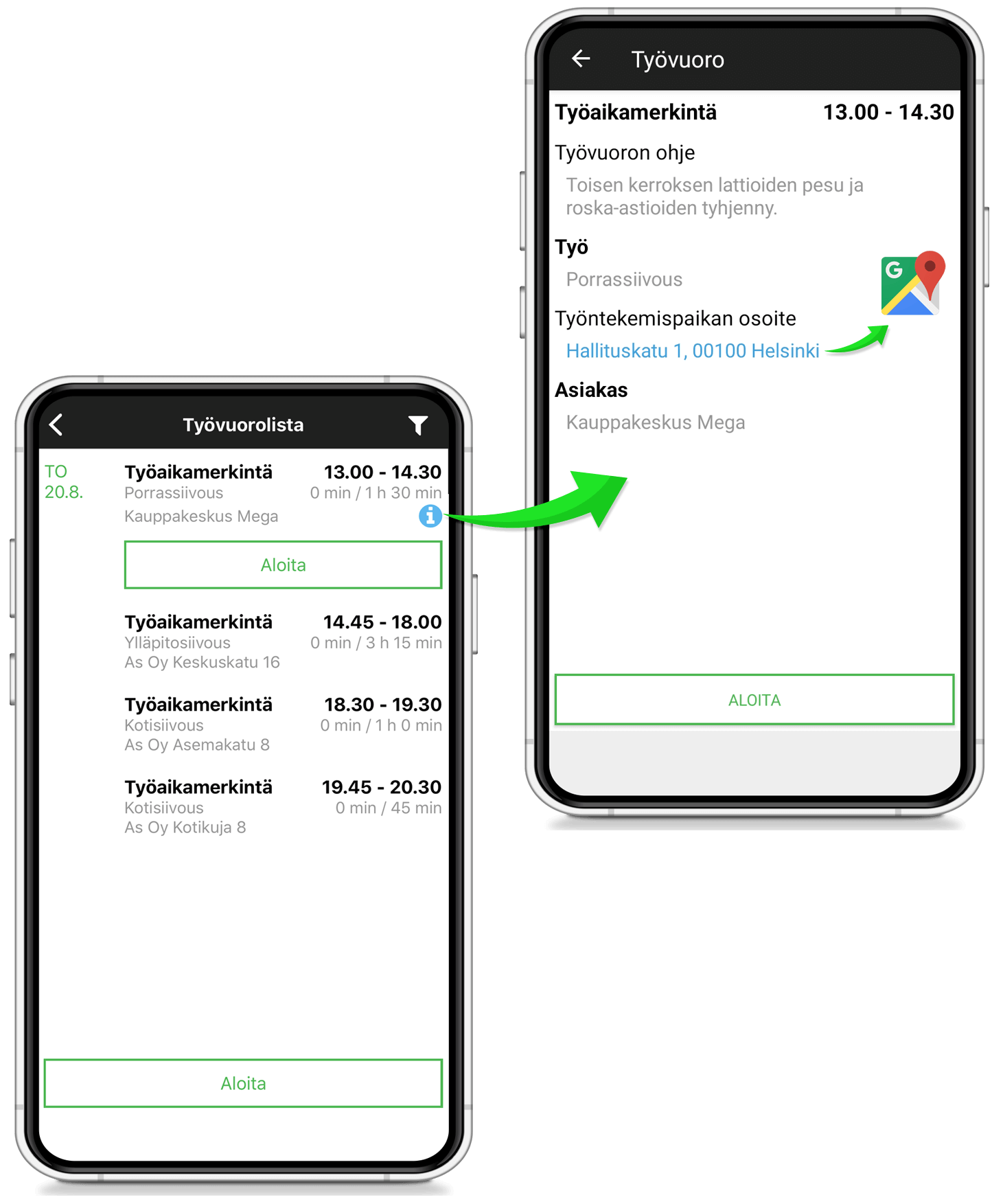 - Ajoreitit, sijaintitiedot ja kohteessa käytetty aika tallentuvat järjestelmään myöhempää tarkastelua varten