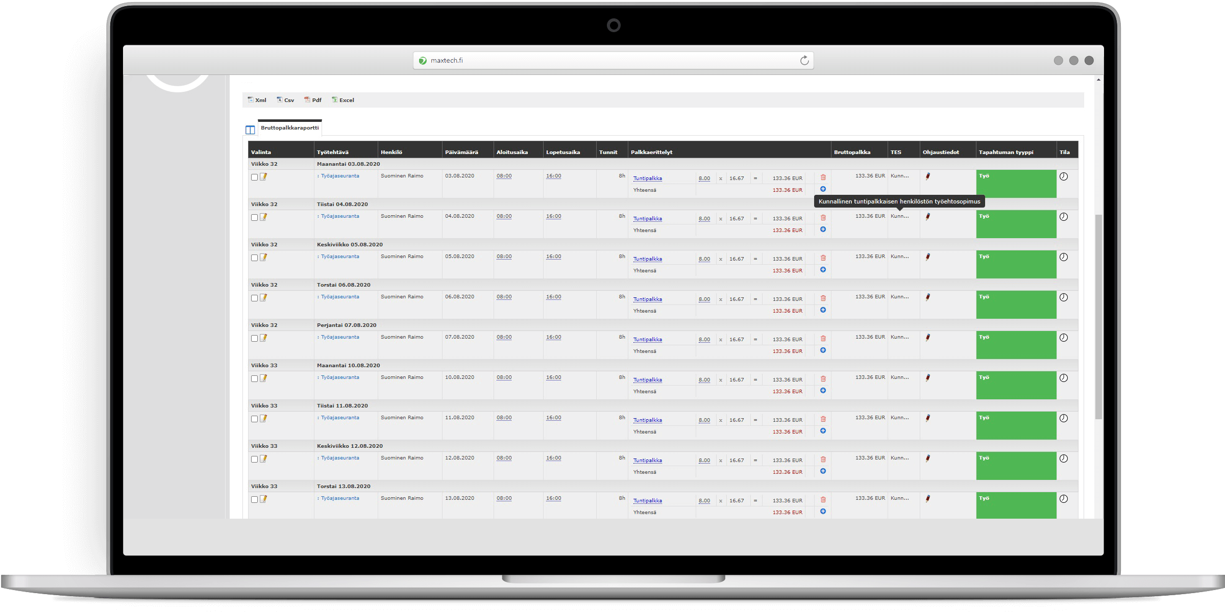 - Kokonaistyöaikaraportti työaikalain määrittämien työaikarajojen seuraamiseen